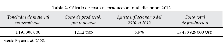 Los estudios de mineralogía de Goldcorp expuestos en el "Peñasquito Project Technical Report", elaborado en marzo de 2009 por Bryson et al. (2009: 22), arrojan reservas probadas y probables de 17.4 millones de onzas de oro, 1 046 millones de onzas de plata, 15 334 millones de libras de zinc y 7 062 millones de libras de plomo. Metales que serán extraídos en un periodo de 22 años a partir de la inauguración del enclave en 2010. El valor a diciembre de 2012 de estas reservas puestas en el mercado era de 84 000 millones de dólares, según promedio de las cotizaciones de oro y plata en onzas y de zinc y plomo en libras a esa fecha. El Proyecto Peñasquito tiene un costo de producción de 12.12 dólares por tonelada minada y procesada (Bryson et al., 2009: 109). El volumen total del material mineralizado que será removido es de 1 191 millones de toneladas (Bryson et al., 2009: 109). Ello supone un costo total de producción de 14 434 millones de dólares en 2009. Un monto que, ajustado a la tasa de inflación de 6.9% de 2010 a 2012 conforme a la economía estadounidense, a diciembre de 2012 implica un costo de producción de 15 430 millones de dólares.8 En resumen, el valor de venta de los metales extraídos del yacimiento Peñasquito es de 84 053 millones de dólares. El costo total de producción es de 15 430 millones de dólares. La ganancia neta de este negocio minero será de 42 518 millones de dólares antes de impuestos. Por supuesto, estas estimaciones no son exactas, pues varían conforme a la cotización mundial de los metales y de los insumos. Lo relevante aquí es mostrar el tamaño del negocio, un motivo de peso que explica la voluntad corporativa por consumar la desposesión de los campesinos propietarios del valle de Mazapil.