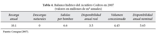 En la tabla 4 se muestra el balance hídrico de Cedros. La recarga anual medida en millones de m3 se compone de dos tipos de entradas al acuífero en el transcurso de un año: la recarga vertical, que es el volumen de agua de lluvia que se infiltra hacia el subsuelo,14 y la recarga horizontal, correspondiente al volumen de agua que ingresa en el acuífero por medio de flujos subterráneos. Los valores anuales de estos dos volúmenes fueron de 5.4 millones m3/a y 4.7 millones m3/a, respectivamente, lo cual resultó en una recarga media anual de 10.1 millones de m3.