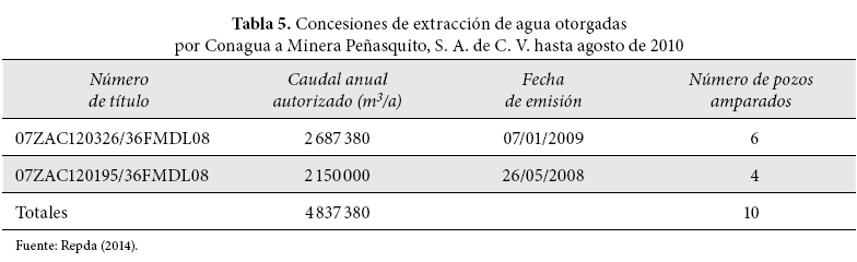 En el informe técnico de Minera Peñasquito de 2009 Goldcorp declaró ante sus accionistas internacionales que contaba con permisos para extraer 35 millones de m3/año. Luego, con lenguaje confuso, dice contar con dos concesiones otorgadas, una en agosto de 2006 y otra a principios de 2008, por 4.9 y 9.1 millones m3/a, respectivamente (Bryson et al., 2009: 31-32). Sin embargo, en agosto de 2010 en el Registro Público de Derechos del Agua (Repda) aparecían sólo dos concesiones a nombre de Minera Peñasquito con un volumen autorizado total de 4.8 millones de m3/a mediante diez pozos.16 Al parecer Goldcorp mintió a sus accionistas. En la tabla 5 se muestra el volumen de agua autorizada y los pozos amparados en ambos títulos de concesión otorgados por Conagua hasta agosto de 2010. Con esas dos concesiones Conagua dio a Minera Peñasquito casi el remanente nominal de agua disponible del acuífero, de modo que formalmente se llegó a una situación de equilibrio en el balance hídrico en términos administrativos. Sin embargo, de acuerdo con Bryson y con base en datos de la propia empresa, Minera Peñasquito estaba extrayendo un volumen de 8 millones m3/a en 2009 y esperaba duplicar la cifra para el siguiente año (Bryson et al., 2009: 105), lo que constituyó una confesión de que la compañía minera tomaba casi el doble de agua de lo que se le había concesionado por ley, con lo que de facto llevaba a la cuenca a un déficit hídrico real de -4.5 millones m3/a.