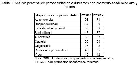 En la Tabla II se puede apreciar que los alumnos encuestados con promedio académico alto, presentan percentiles más elevados en los aspectos ascendencia, responsabilidad, sociabilidad, autoestima y relaciones personales que los alumnos encuestados con promedio académico mínimo.