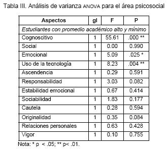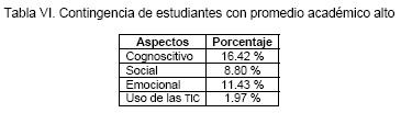 La Tabla III muestra la presencia de una diferencia estadística significativa entre los alumnos con promedio académico alto y mínimo, en los aspectos cognoscitivo, emocional y uso de las TIC.