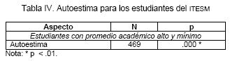 La Tabla IV indica que hay una diferencia estadística significativa a favor de los alumnos con promedio académico alto, en el área de autoestima, con respecto a los estudiantes encuestados con promedio académico mínimo.