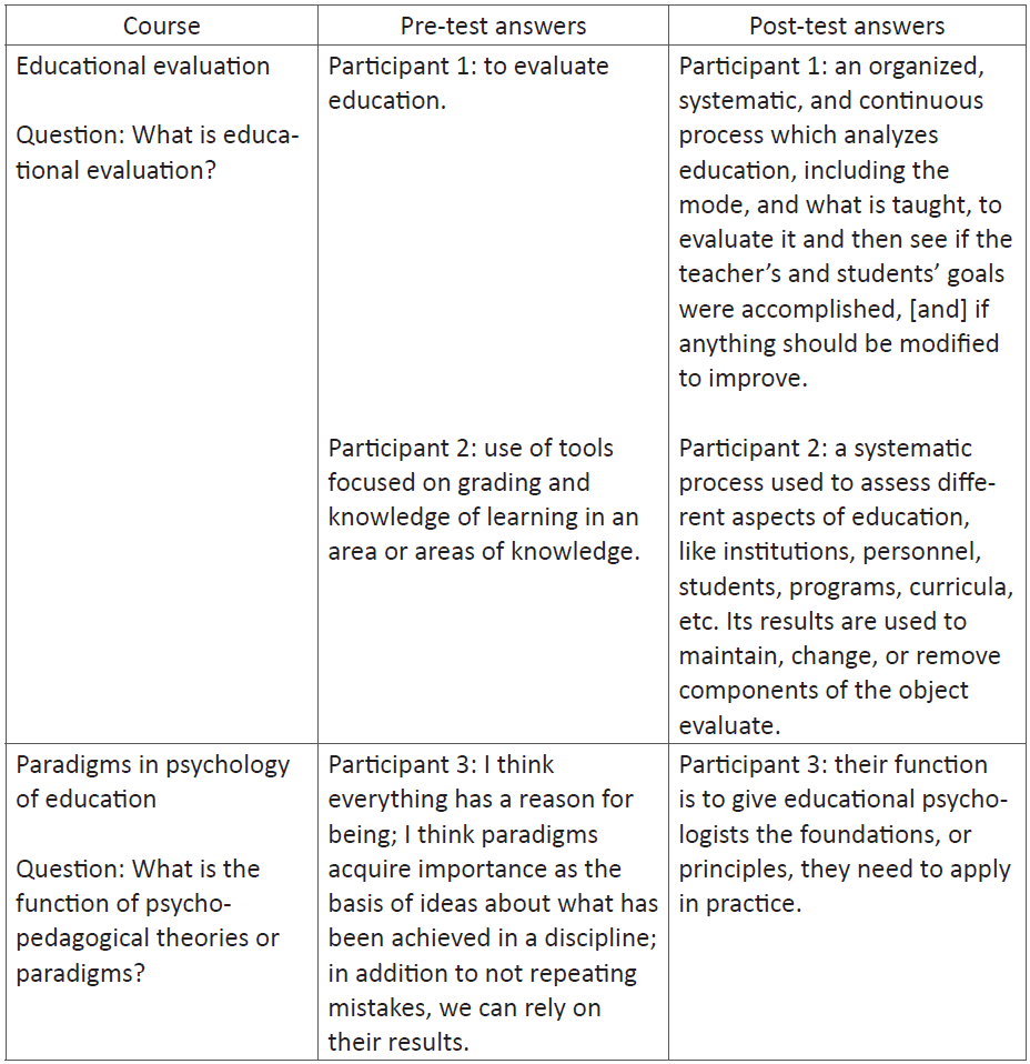 To exemplify the qualitative changes found, Table 3 compares the open answers given by the same student on the pre-test and the post-test for the courses Educational evaluation and Paradigms in psychology of education. The example of the course on Sociocultural theory is not presented because the test applied was objective.
