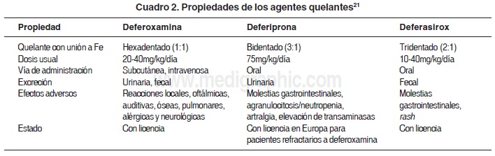 Tratamiento. En la actualidad, la terapia de quelación de hierro se realiza con deferoxamina, deferiprona o deferasirox. Cuando la deferoxamina se administra por vía subcutánea se recomiendan 20-40 mg/kg/día en infusión continua de 10-12 horas, de preferencia nocturna, con bomba de infusión, durante 5 días a la semana, hasta lograr niveles de ferritina sérica ≤500 µg/L. Igualmente, para la vía intravenosa se utilizan de 20-40 mg/ kg/día, administrados durante 12-14 horas en infusión continua. No se recomienda la administración intramuscular por su baja acción quelante. La dosis usual de deferiprona es de 75 mg/kg/día. El deferasirox en dosis de 20-40 mg/kg puede producir una tasa de excreción de hierro de 0.3 mg/kg/día, que permite mantener el equilibrio férrico en pacientes con transfusiones; posee una potencia comparable a la deferoxamina.