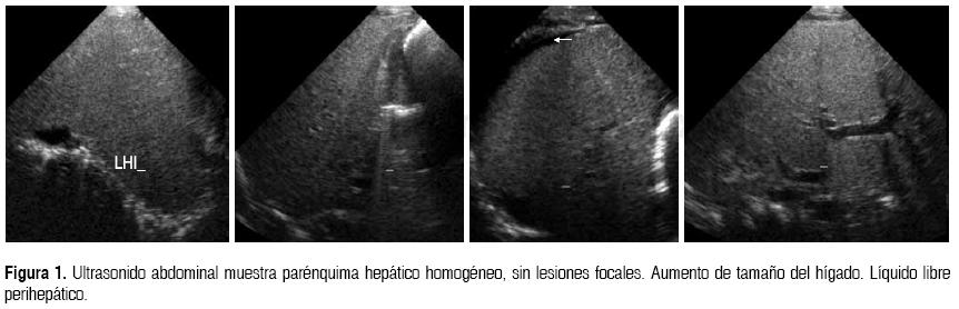 En el ultrasonido se observa hepatomegalia de ecogenicidad homogénea, no hay dilatación de vías biliares intra ni extrahepáticas (Figura 1).