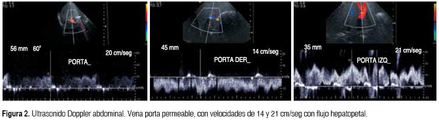 Con la señal Doppler a nivel del hilio hepático, la porta se observa con velocidad de 10 cm/seg. A nivel del hilio esplénico muestra 24 cm/seg. La arteria hepática con IR de 0.85 (Figura 2).