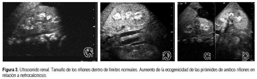 En el ultrasonido renal, los riñones se encuentran discretamente aumentados de tamaño, las pirámides que normalmente son hipoecoicas se observan hiperecoicas a expensas de calcificaciones de bordes mal limitados compatibles con nefrocalcinosis (Figura 3).