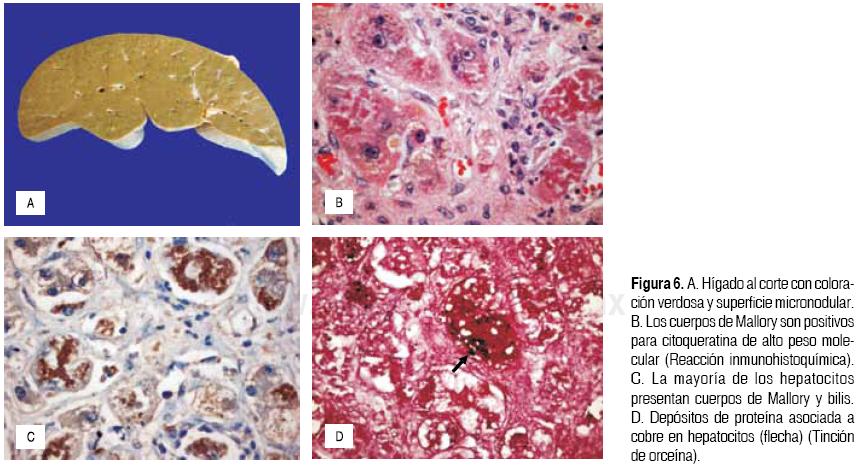 El hígado está aumentado de tamaño y peso, su superficie externa y de corte es micronodular, verdosa y los nódulos miden menos de 3 mm. Histológicamente se observan nódulos de regeneración rodeados por tabiques de tejido conectivo, con proliferación de colangiolos. En los nódulos existe fibrosis intersticial y los hepatocitos muestran numerosos cuerpos hialinos de Mallory, colestasis y degeneración de hepatocitos con satelitosis por polimorfonucleares. En las reacciones de inmunohistoquímica, los cuerpos de Mallory son positivos para citoqueratinas de bajo y alto peso molecular y la intensidad de la tinción es mayor para citoqueratina de alto peso molecular (Figura 6). No se cuenta con tinción de histoquímica para demostrar cobre, por lo que se realizó tinción con orceína para demostrar el depósito de la proteína asociada a cobre, la cual es positiva en el citoplasma de los hepatocitos. Los riñones están aumentados de tamaño y presentan datos de necrosis tubular aguda y cilindros de pigmentos biliares. El estudio microscópico del tubo digestivo solamente muestra cambios de miopatía visceral hipóxicoisquémica secundaria a choque, y los pulmones con una neumonía aguda en fase de resolución. En la médula ósea, los precursores de las tres series no presentan alteraciones y existe osteopenia leve. El timo es pequeño y atrófico. El cerebro muestra atrofia subcortical y dilatación de los ventrículos. Los diferentes cortes histológicos de la corteza y núcleos grises se encuentran con cambios crónicos, caracterizados por pérdida neuronal y encefalopatía metabólica, así como necrosis multifocal de neuronas reciente (Figura 7). Las malformaciones congénitas que se encontraron en este paciente son un cavum septum pellucidum, comunicación interauricular tipo foramen oval de 2 mm, y hemangioma capilar en mesocolon de ciego (Figura 8). Estas últimas no fueron detectadas clínicamente.
