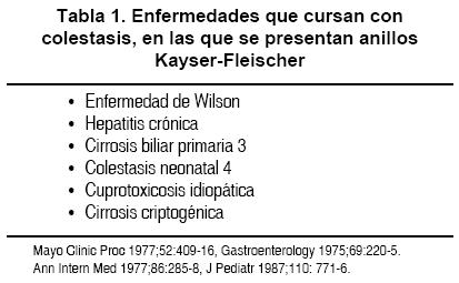 En la autopsia, el paciente muestra ictericia generalizada, distensión abdominal, red venosa colateral, hernia umbilical, hidrocele bilateral y en los ojos se observa coloración oscura en el limbo esclerocorneal que corresponde a anillos de Kayser- Fleischer (Figura 5). En los niños se han descrito anillos de Kayser-Fleischer en varias enfermedades que cursan con colestasis (Tabla 1) y son debidos al depósito de cobre en la membrana de Descement.
