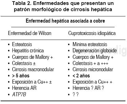 Las enfermedades metabólicas que presentan un patrón morfológico de cirrosis hepática incluyen a la enfermedad de Wilson y a la cuprotoxicosis, entre otras (Tabla 2).9 Los cambios morfológicos pueden ser indistinguibles en las fases iniciales; sin embargo, existen algunas diferencias que hacen posible su separación cuando se analizan las biopsias. Los datos más importantes son la edad a la presentación de los síntomas, el antecedente familiar o el antecedente de la exposición a utensilios de cobre. También se recomienda el estudio molecular.