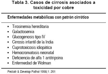 La acumulación de cobre en el hígado ha sido observada en una variedad de enfermedades hepáticas pediátricas que incluyen: enfermedad de Wilson,3 cirrosis del niño indio,4 toxicosis idiopática por cobre;5 estas dos últimas han sido relacionados con dietas ricas en cobre. La toxicosis idiopática por cobre (TIC) aparece esporádicamente fuera del continente indio; se han reportado 15 casos por década en las últimas décadas.6 Existe un cuadro clínico que es indistinguible de ésta, que se llama cirrosis infantil endémica del tirol.7 En México, este cuadro clínico ya ha sido reportado por Valencia y Gamboa, en 1993.8