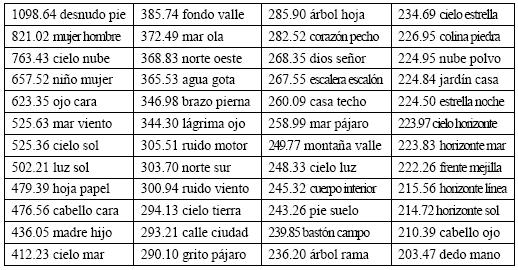 Escojamos por ejemplo el ítem cielo, que refleja claramente una temática cara a nuestro autor; he aquí las concurrencias más próximas al polo: cielo, nube, sol, mar, tierra, luz, estrella, horizonte, pájaro, viento, color, agua, avión, montaña, luna, espacio, centro, humo, relámpago, noche, mujer, colina, río, valle, techo, extensión, árbol, llanura, línea, lluvia, hola, arena, piedra, hierba, mano, desierto, resplandor, gente, derecho, fondo, duna, ala, bruma.