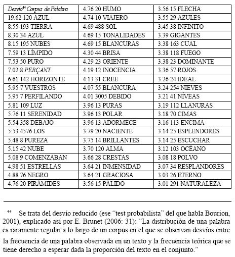 44 Se trata del desvío reducido (ese "test probabilista" del que habla Bourion, 2001), explicado así por E. Brunet (2006: 31): "La distribución de una palabra es raramente regular a lo largo de un corpus en el que se observan desvíos entre la frecuencia de una palabra observada en un texto y la frecuencia teórica que se tiene derecho a esperar dada la proporción del texto en el conjunto."