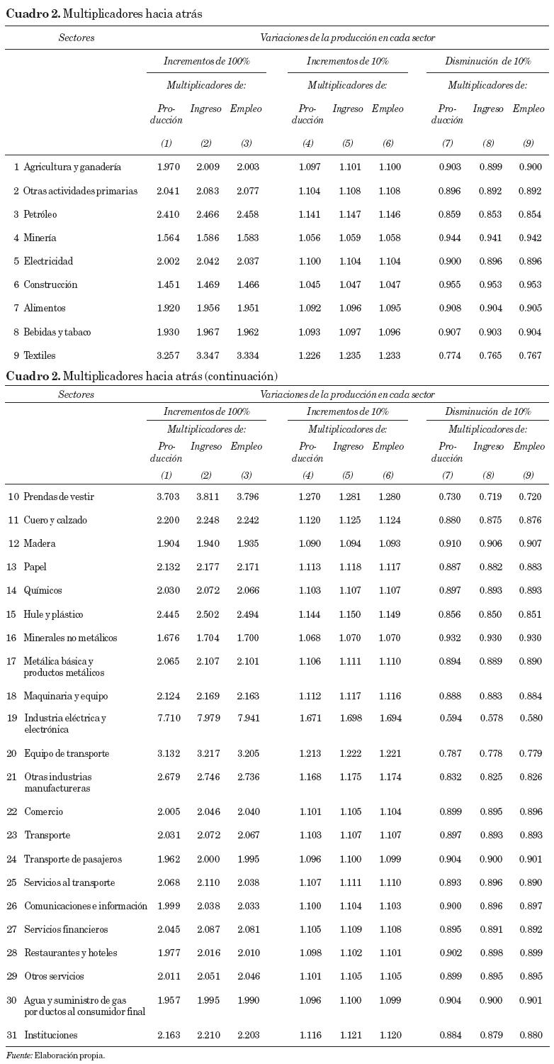 Los cálculos se muestran en el cuadro 2 y se presentan los multiplicadores para un aumento de 100 por ciento de la inversión en el sector j (o sector de análisis), así como aumentos y reducciones de 10 por ciento. Es importante destacar que los aumentos de 100 por ciento, si bien son poco realistas, son útiles porque muestran la interdependencia entre sectores y son, de hecho, equivalentes a los multiplicadores de insumo-producto, mismos que se refieren a cambios unitarios, es decir, muestran los impactos potenciales. Por su parte, los aumentos y reducciones más moderados (de 10%) serán de utilidad para estimaciones más puntuales en la siguiente sección.