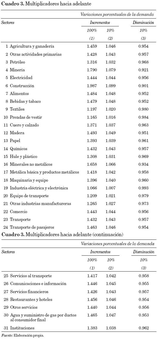 Para calcular los multiplicadores hacia adelante, la simulación consiste en suponer un incremento en el nivel de actividad (demanda) de todos los sectores simultáneamente, por lo que para su cálculo sólo se requirió una simulación para cada uno de los tres escenarios, 100 por ciento, 10 por ciento y disminución de 10 por ciento.