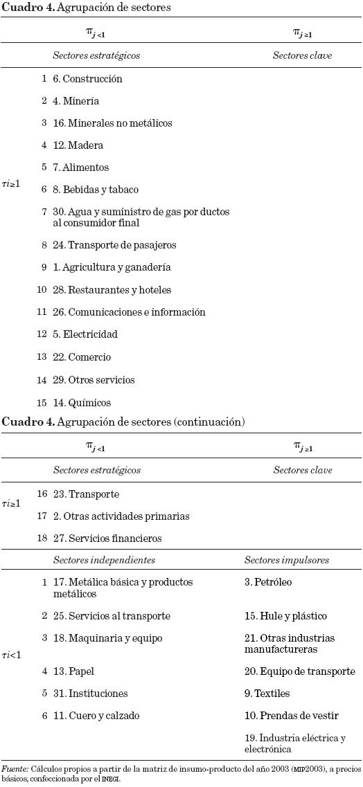 Donde valores de π > 1 serían sectores con encadenamientos hacia atrás por arriba del promedio de la economía, y lo opuesto para valores de π < 1. Por su parte, valores de τ > 1 representan sectores cuyo encadenamiento hacia adelante es mayor que el promedio, y viceversa para valores de τ < 1.