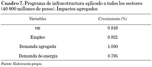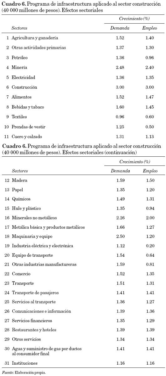 El cuadro 5 presenta los resultados agregados de una inversión de 40 000 millones de pesos en el sector construcción, en tanto que los resultados de impactos sectoriales se muestran en el cuadro 6. Como se observa, el PIB crece 1.39 por ciento, el empleo agregado lo hace 1.4 por ciento, en tanto que la demanda agregada crece 1.57 por ciento, y un indicador de demanda de energía lo hace en 1.21 por ciento.