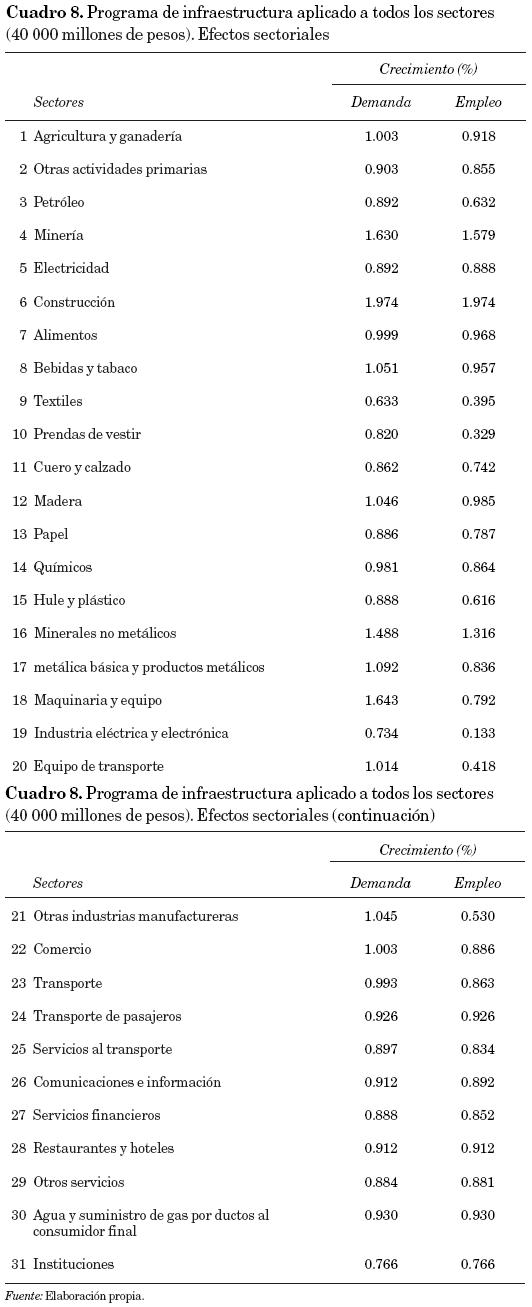 El segundo ejercicio, como ya se explicó, consistió en simular el mismo monto de inversión de 40 000 millones de pesos, pero ahora distribuido proporcionalmente entre la inversión de todos los sectores. Los resultados agregados se muestran en el cuadro 7, en tanto que los efectos sectoriales se presentan en el cuadro 8.