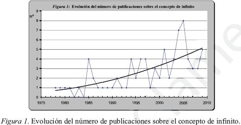 Desde que Fischbein, Tirosh y Hess (1979) publicaron su trabajo empírico y pionero, llamado "The intuition of infinity", son ya más de setenta las investigaciones sobre las características cognitivas del infinito que han visto la luz (Figura 1). Entre los artículos y más de una decena de tesis doctorales hechos en este campo de estudio podemos distinguir algunos trabajos que siguen la línea de paradigmas ya establecidos en el terreno de la Educación Matemática, y aquellos que abordan alguna de las singularidades propias de este concepto desde una perspectiva mixta, la cual incluye aspectos de diferentes teorías; algunas serán consideradas a continuación.