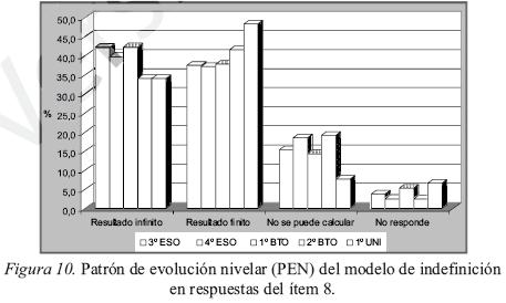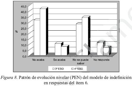 Como podemos observar en la Figura 8, los porcentajes se han incrementado sensiblemente, pero mantienen el tipo de argumentos que se expresaron en el caso anterior. El paralelismo entre la primera serie de este gráfico, no se acaba, y la tercera, no se puede saber, destaca la naturaleza de esas afirmaciones aunque son respuestas independientes y establece un vínculo inevitable entre este modelo y el carácter inacabable del proceso. Tal hecho, que marca el esquema conceptual de manera sólida, incapacita a estos individuos para aventurar un resultado del proceso, a pesar de su clara convergencia. La contradicción entre la convergencia y la infinitud del proceso se resuelve una vez más mediante el modelo intuitivo de indefinición.