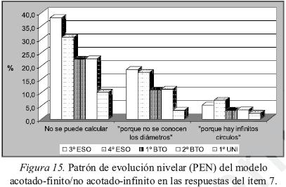Este modelo, aunque se halla presente en la literatura especializada, no ha sido identificado como tal ni tratado con suficiente detalle. Es producto de la relación que establece un número importante de sujetos entre la definición acotada o no acotada de un conjunto y el cardinal de sus elementos. La primera opción induce, por lo general, a actitudes finitistas (llega un momento en que ya no caben más círculos en el triángulo porque llegamos al vértice) o infinitistas actuales (la suma de todos los diámetros será como mucho la altura del triángulo). No obstante, es preciso indicar que su frecuencia depende si el contexto es geométrico o numérico y, evidentemente, del nivel educativo. Por su parte, la ausencia de cotas origina en mayor medida expresiones infinitistas bajo una perspectiva potencial: en [0, ∞] hay más números que en [0, 1] porque no acaba. Así, el hecho de que representemos el conjunto o conjuntos a evaluar mediante intervalos o segmentos, notación conjuntista o recintos bidimensionales tendrá una repercusión definitiva en la expresión del sujeto. Podemos observar el PEN de este modelo intuitivo en dos de los ítems ya considerados. En la Figura 15 aparecen los resultados obtenidos en el ítem 7 (ver apartado 5.1) y se comprueba la presencia de las expresiones citadas. Sin embargo, es preciso advertir que el porcentaje de estudiantes que ofreció algún tipo de justificación fue muy bajo con respecto al de las respuestas de la categoría resultado finito. Este dato, junto con el gran número de sujetos que consideraron que no se puede calcular, muestra una inseguridad evidente a la hora de recurrir a los modelos anteriores. Por ello, incluimos la subcategoría aunque es una suma indefinida, la cual manifiesta una duda por la contradicción entre la respuesta finita y el número de objetos que intervienen en la suma, lo que revela el conflicto cognitivo entre los dos modelos anteriores.