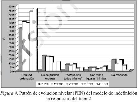 También en el ítem 2 (Tabla III) se nota cómo un porcentaje significativo de estudiantes con un PEN decreciente, pero con cierto grado de estabilidad, particularmente en el Nivel I, declara la imposibilidad de resolver el problema (no se pueden ordenar) debido a la indefinición que supone tal magnitud7 (Figura 4): porque todos estos conjuntos son infinitos.