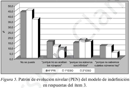 Por último, el PEN correspondiente al ítem 5 presenta una tendencia inversa a la de los casos anteriores. Este supuesto, típico de la división indefinida, da lugar al modelo de indefinición como elemento emergente, a diferencia del caso geométrico equivalente división indefinida de un segmento, en el que no se hallan valores significativos.