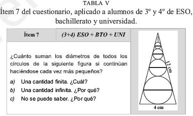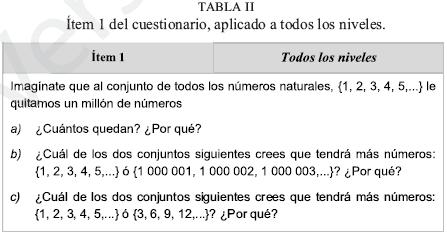 Tras someterlo a triangulación, aplicarlo a grupos piloto de alumnos de los niveles considerados y efectuar el correspondiente análisis de las respuestas, se procedió a redactar el cuestionario definitivo. Para ampliar el número de preguntas y, con ello, la redundancia de ciertos tópicos bajo representaciones diferentes, se diseñaron dos tipos de cuestionarios para cada nivel no universitario y tres para el nivel universitario. Seis de los ítems fueron comunes a todos los niveles. Los diferentes ítems de los cuestionarios se ubicaron dentro de cada uno de los tópicos hallados en la revisión bibliográfica: comparación y equivalencia de conjuntos continuos y discretos, divisibilidad indefinida, series convergentes, operatividad e infinito, lenguaje del infinito e inducción2.