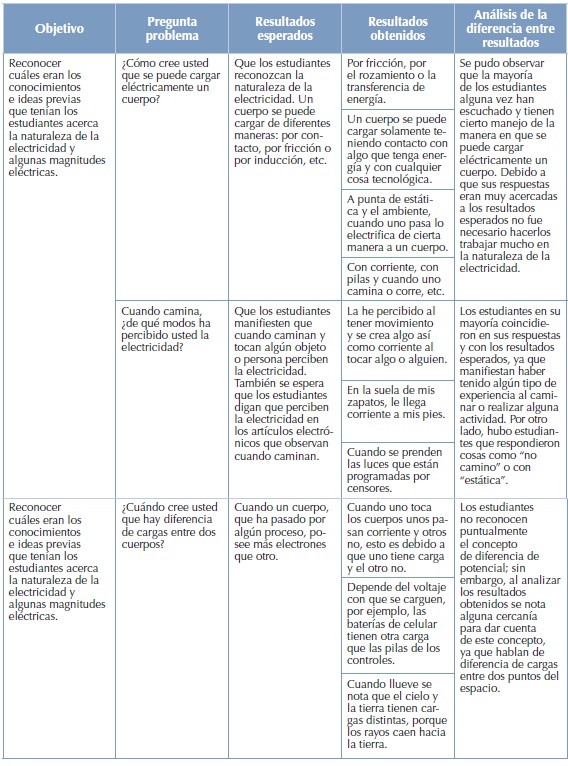 En el documento de trabajo planeado para que los estudiantes trabajarán en la sesión 1 se hicieron preguntas que plantearan problemas, con el fin de saber cuáles eran los conocimientos e ideas previos que tenían los estudiantes acerca de la naturaleza de la electricidad y algunas magnitudes eléctricas y, a partir de esto, hacer una introducción y definir estas temáticas. El análisis respectivo se muestra en el siguiente cuadro.
