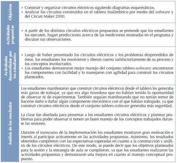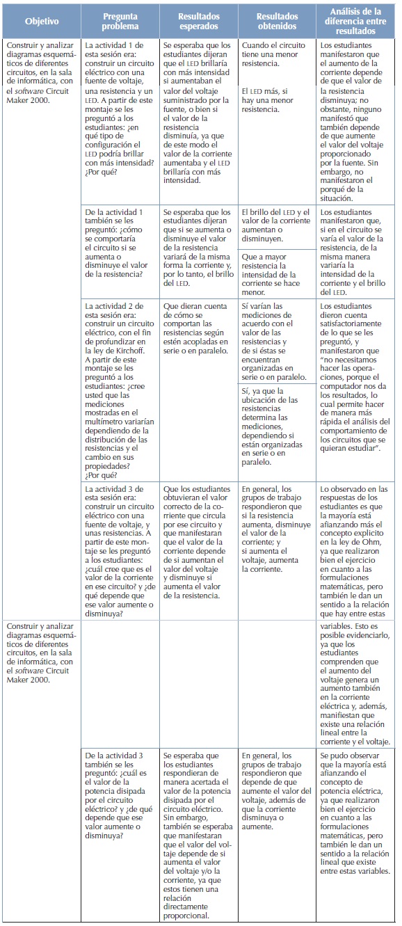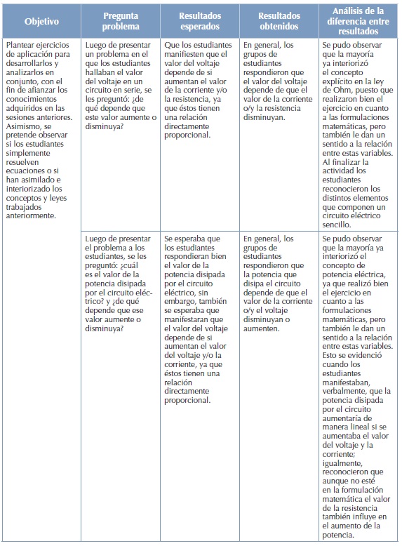 Se planteó la construcción de varios circuitos eléctricos para, desde allí, plantear problemas a desarrollar y analizar en conjunto, con el fin de afianzar los conocimientos adquiridos que se habían venido desarrollando. Asimismo, se pretende observar si los estudiantes simplemente resuelven ecuaciones o si han afianzado los conceptos y leyes trabajados anteriormente. El análisis respectivo se mostrará en el siguiente cuadro.