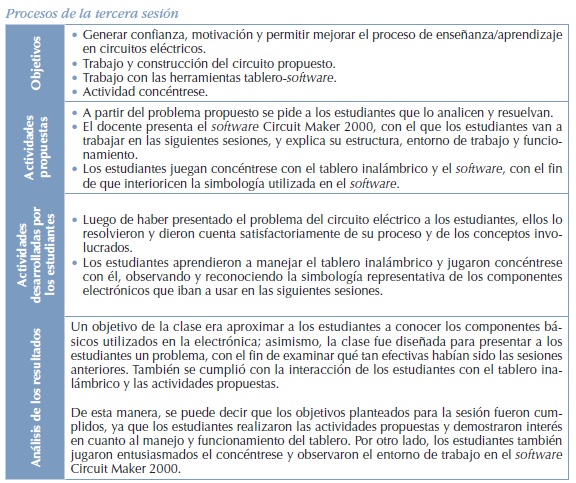 Se pretende que de manera interactiva el estudiante trabaje tres sesiones con las herramientas tablero-software y construya circuitos eléctricos sin temor a dañar o hacerse daño con los componentes eléctricos y los circuitos eléctricos. Los contenidos de estas sesiones son: