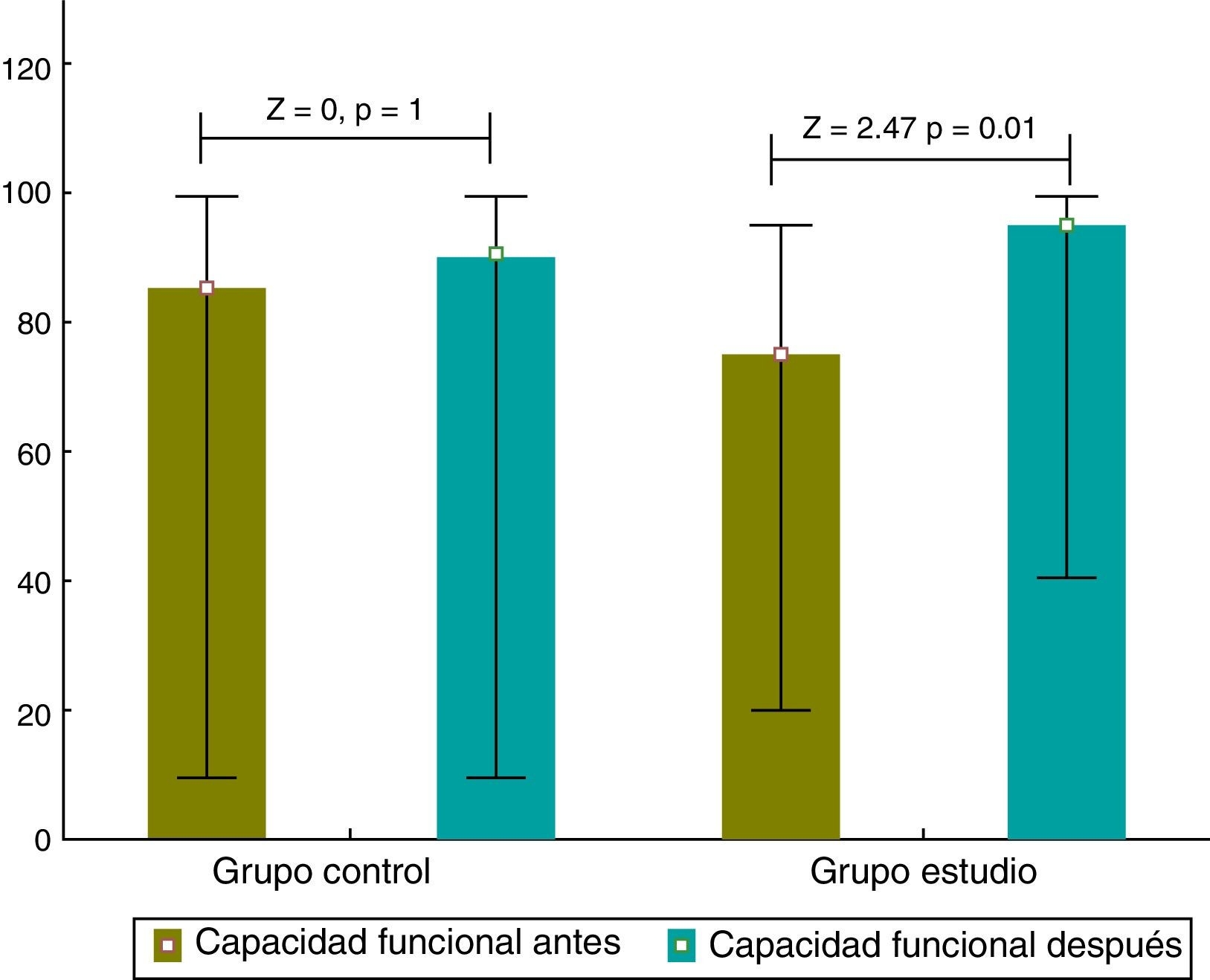 Al realizar la prueba de Wilcoxon en grupos dependientes para comparar los puntajes de mediana en la CF antes y después de la intervención (fig. 1), no se observaron diferencias significativas en el GC cuyos resultados fueron 85 vs. 90 puntos (Z = 0, p = 1). Sin embargo, en el GE, se aprecia un incremento estadísticamente significativo al obtener como resultados 75 vs. 95 puntos (Z = 2.47, p < 0.01).