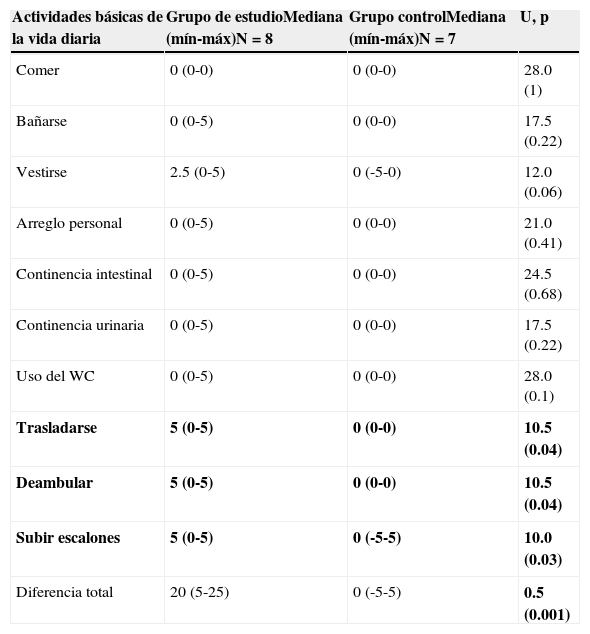 La prueba U de Mann Whitney para grupos independientes posibilitó constatar significación estadística al comparar los valores totales de mediana antes y después de la intervención con MTC (tabla 2), los resultados de la diferencia total entre grupos fue: 0 (5-5) para GC y 20 (5-25) para GE (U = 0.5, p < 0.001). De igual forma, esta prueba permitió observar que en las ABVD trasladarse (U = 10.5, p < 0.04), deambular (U = 10.5, p < 0.04) y subir escalones (U = 10, p < 0.03) se obtiene significación estadística.