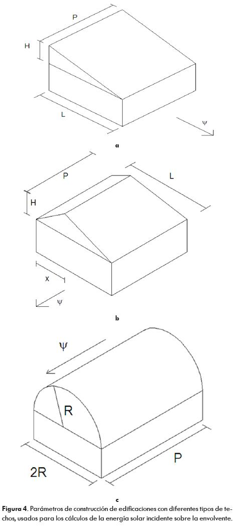 Se analizan los cambios de un techo horizontal por un techo inclinado, uno de dos aguas y uno de bóveda de cañón, cuyas parametrizaciones para calcular la energía sobre la envolvente se muestran en la figura 4. Los cálculos de radiación se hacen de manera convencional a partir de la radiación directa sobre el plano inclinado. La radiación sobre la bóveda de cañón se calcula de la misma forma, aproximando la superficie con tiras planas a lo largo de la bóveda (Figura 4c).