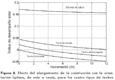 En la figura 5 se muestra el efecto de alargar desde 8 a 20 m las fachadas laterales de la construcción de referencia. El desempeño de la construcción disminuye de manera casi imperceptible cuando está orientada de este a oeste (azimut 90°) y muy acentuada cuando está orientada de norte a sur (azimut 0°), como ya se vio en la sección anterior.