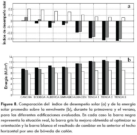En la figura 8 se muestran en color negro los histogramas correspondientes a los valores reales de estas construcciones, tanto para el índice de desempeño solar, como para el valor de energía solar promedio que recibe la envolvente diariamente durante la primavera y el verano. La única construcción que tiene un valor positivo del índice real es la cancha, que es una construcción cerrada con techo horizontal de usos múltiples.