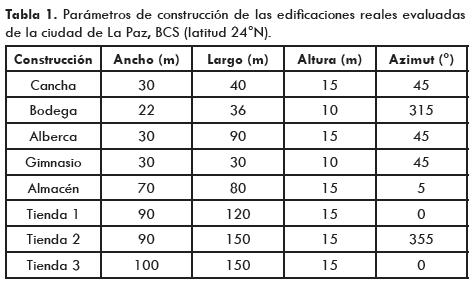 Es frecuente encontrar construcciones con techos grandes usadas como almacenes, centros deportivos y tiendas de autoservicio. Con el objeto de ofrecer un ejemplo con construcciones reales, en la tabla 1 se presentan los parámetros de construcción de este tipo de edificaciones con techo horizontal que serán evaluadas con el índice, todas ellas localizadas en la Cd. de La Paz. En este tipo de construcciones, el techo se convierte en un enorme colector solar.