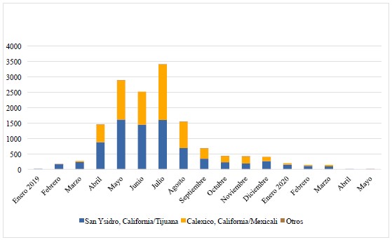 Graph 3 MPP cases in the court of San Diego, California, by hearing location at Baja California borders, from January 2019 to May 2020
