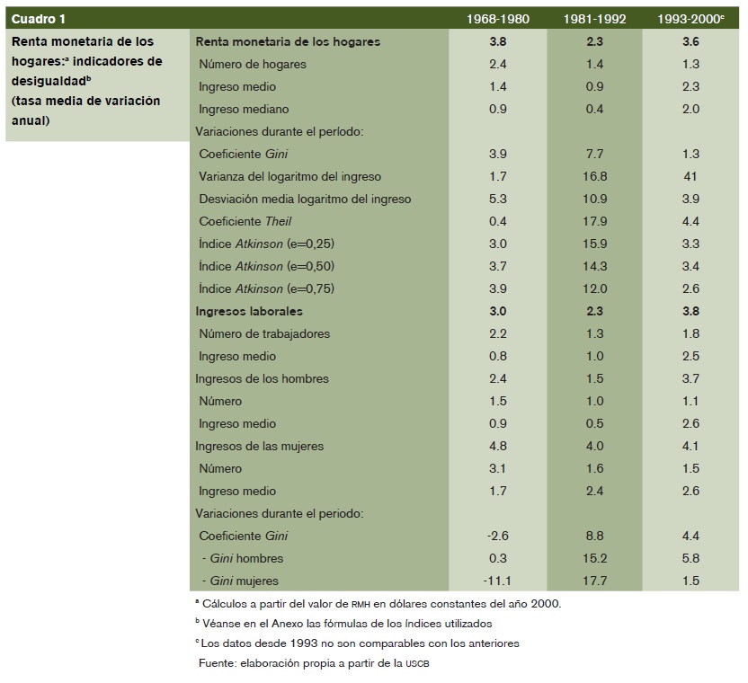 En cuanto al vínculo entre los ingresos laborales y la renta de los hogares, los indicadores muestran que en el período 1968-1980 se redujo la desigualdad en la distribución de IL a la vez que aumentaba en la RMH, mientras que en los dos períodos siguientes sí se aprecia un mayor desigualdad en ambas. No obstante, esta correspondencia tampoco expresa una relación de causalidad unívoca si se tiene en cuenta que la desigualdad aumentó con más rapidez en IL que en la RMH, pero el índice Gini de IL siguió siendo inferior al de la RMH; así se aprecia incluso cuando sólo se consideran los ingresos laborales de los hombres cuya desigualdad es bastante mayor que en las mujeres, pero cuyo índice es menor que el de la RMH. Consecuentemente, para explicar la desigualdad de la RMH hay que contar con la notable influencia que ejercen los otros dos componentes de la renta doméstica -los ingresos de la propiedad y las transferencias públicas-, pues el ingreso medio de las rentas laborales sólo representa 60% de la renta media de los hogares.