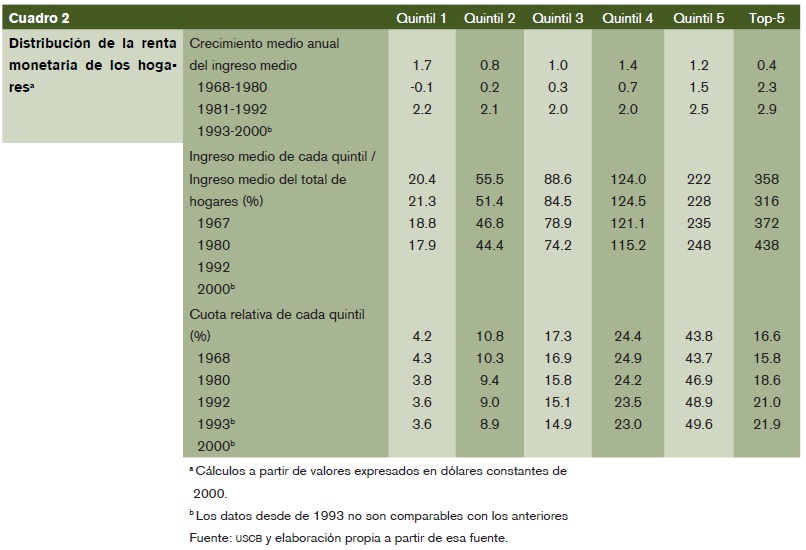 La intensidad alcanzada por la desigualdad puede apreciarse en las siguientes comparaciones. La relación entre la renta de top-5 y la de Q1 aumentó desde 6.0 en 1968 a 7.9 en 1992 y 8.1 en 2000. Lo mismo sucedió con la relación entre la renta de top-5 y la de 50% de los hogares con menores ingresos, que pasó de 2.6 a 3.2 y 3.5. En 2000 la renta media de Q1 sólo suponía 18% de la renta media de todos los hogares, la de Q2 era inferior a 45% y la de Q3 no alcanzaba 75%; en el otro extremo, la renta media de Q5 era 2.5 veces superior a la media general y la de top-5 era casi 4.5 veces más alta (Este análisis sobre la participación de cada quintil en la renta no tiene en cuenta las variaciones que, simultáneamente, se producen al interior de cada quintil, cuyo conocimiento necesita otro tipo de información y de técnicas estadísticas).