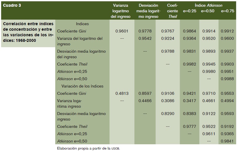 El aumento de la desigualdad se confirma por los distintos indicadores de concentración de la renta que se exponen en el cuadro 1, que ponen de manifiesto su crecimiento de un período a otro desde 1968 a 2000, siendo especialmente rápido entre 1980 y 1992. El cuadro 3 muestra la elevada correlación que existe tanto entre los valores que toman los índices, como entre sus respectivas variaciones anuales, con la sola excepción de los datos referidos a la varianza del logaritmo del ingreso cuyos coeficientes de correlación son inferiores, sin que ello tenga relevancia para el tema de análisis.6 En el caso del índice Gini, expresando su significado a través de la curva de Lorenz, si se trazaran las curvas de la distribución de la RMH durante esos períodos, se observaría un progresivo aumento de la tangente de las curvas en los puntos correspondientes al quintil superior y en particular al tramo más alto de sus percentiles. Igualmente, resulta significativo que en el último período si se utiliza el índice de Atkinson el crecimiento más rápido se haya producido cuando el parámetro toma los valores inferiores, es decir, cuando resulta más sensible a los cambios que se operan en los grupos de rentas más altas.