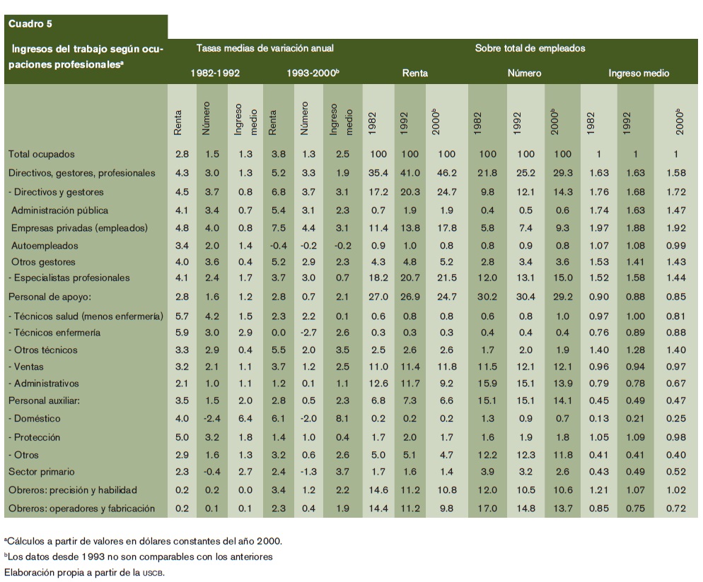 Simultáneamente se han modificado las características retributivas de la estructura ocupacional, teniendo presente que durante los años ochenta el ingreso medio del conjunto de los empleados aumentó lentamente (1.3% anual) y lo hizo a mayor ritmo (2.5% anual) en 1993-2000. Con tal premisa, pudiera sorprender el hecho de que en los años ochenta el crecimiento del ingreso medio del grupo DGE fuese similar al del conjunto de los empleados y que en los años noventa fuera incluso inferior. Sin embargo, debe tenerse en cuenta que ese grupo no sólo integra a los directivos y gestores de alto nivel (formativo y de ingresos), sino también a muchas otras ocupaciones de menor rango, de empresas más pequeñas y de autoempleo. Lo mismo sucede con los especialistas profesionales, donde coexisten segmentos de elevados ingresos medios (arquitectos, ingenieros, programadores, profesores, médicos, abogados, artistas, escritores, etcétera) con otros que tienen ingresos bastante inferiores y que constituyen una parte considerable de esas mismas profesiones y de otras.