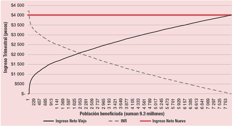 | Tasa Marginal % | INR Promedio Pesos por trimestre | Ingreso Neto Promedio Pesos por trimestre | Población Beneficiada Millones | Disminución del Coeficiente de Gini | Costo Fiscal | |
