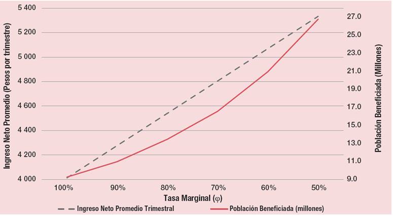 Cuando ϕ disminuye de 100 a 50%, el ingreso neto promedio aumenta 33% al pasar de 4 012 pesos por trimestre (la LBM) a 5 333 pesos por trimestre. Además, la población beneficiada aumenta 189% (al pasar de 9.3 millones a 26.8 millones) con la consecuente disminución en la desigualdad.