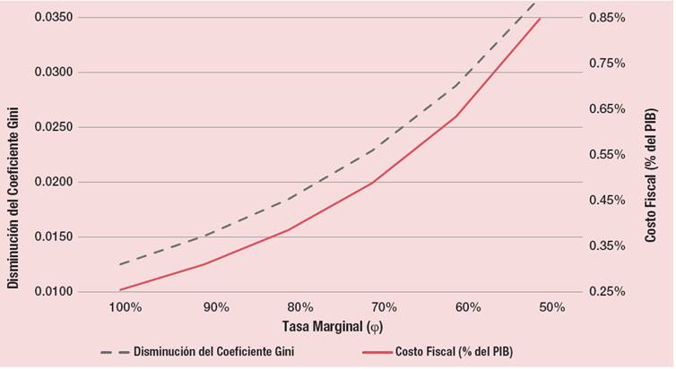 A menor tasa marginal (ϕ) mayor disminución la desigualdad de la distribución del ingreso medida por el Coeficiente de Gini, y, por lo dicho con anterioridad mayor costo fiscal.