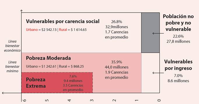 En nuestro caso a treinta años de seguir la orientación y la tutela de unas políticas orientadas a la apertura máxima del mercado y una contracción sistemática del papel del Estado en la economía, nuestro saldo social difícilmente podría ser peor: 53.4 millones de mexicanos son pobres (43.6%). De ellos, 9.4 están en pobreza extrema (7.6%) y 8.6 millones se encuentran por debajo de la línea de bienestar económico (7%)1 están en pobreza extrema (9.4 millones de personas). A este porcentaje, se debe agregar 7.0% (8.6 millones) que se encuentran por debajo de la línea de bienestar económico. En pocas palabras: solamente 27.8 millones de mexicanos (22.6%) no están en condición de pobreza ni de vulnerabilidad.
