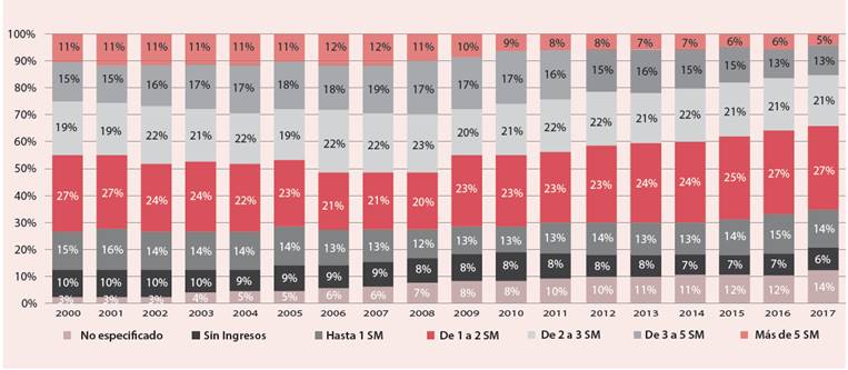 Figura 3 Población ocupada por nivel de ingresos, 2000-2017