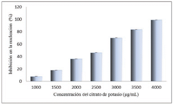 Figura 2 Porcentaje de inhibición del citrato de potasio (C6H5K3O7) sobre la nucleación de cristales de oxalato de calcio.