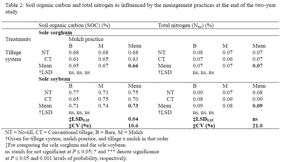 In either of the sorghum and the soybean fields, main effects of the tillage and mulch factors on SOC and Ntot were not significant. Sarno et al. (2004) also found no differences in SOC between NT and CT treatments in an acid soil in Indonesia. Although the present soil was not too acidic, the generally low SOC values suggest that the prevailing soil reaction was favourable for accelerated microbial decomposition of organic matter in the soil. Such a condition may not allow for any appreciable tillage-induced differences in SOC. Moreover, the 0-10 cm layer that was sampled in this study probably exceeded the depth limit of the effect of tillage on SOC for the soil. The impact of tillage system on SOC is usually confined within the very top-(0-5 cm) soil (Chatterjee and Lai, 2009; Lopez-Fando and Pardo, 2009). Chatterjee and Lai (2009) observed that beyond this layer, SOC concentrations under NT and CT indicated comparable values most of the time. The non-significant effect of tillage on Ntot could be due to the sandy nature of this soil (Buschiazzo et al, 1998). Similar observation has earlier been reported in the present site (Anikwe, 2000) and in southwestern Nigeria (Agbede and Ojeniyi, 2009). The present results regarding the effects of the NT and CT on SOC and Ntot are consistent with the findings from a five-year study in the semi-arid region of Tanzania (Shemdoe et al, 2009).