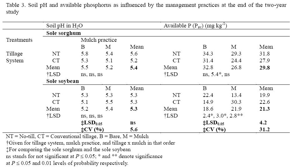 In the sorghum field, the bare-fallowed plots significantly (P ≤ 0.05) enhanced Pav compared to the mulch-covered plots. Saidou et al. (2003) attributed similar observation in a maize field to high P immobilization under surface mulch. In the soybean field, main effects of both the tillage and the mulch factors on Pav were significant (P ≤ 0.05). On one hand, the Pav was enhanced under the CT compared to the NT. This result is consistent with Agbede and Ojeniyi (2009), but contrasts with the more commonly reported findings (Ndaeyo, 2007; Saavedra et al., 2007; Lopez-Fando and Pardo, 2009). The result just reported suggests that the CT may be a better soil management option in P cycling. Though the reason for this is not very clear, the enhanced the SOC status with the poultry manure applied before tillage operations in each year implies that most of the SOC constituents at the end of the study would be organic rather than inorganic. The fact that SOC is a major source of organic P (Basamba et al., 2006) would be expected to be more evident in the soybean field with relatively high SOC content (Table 2). Research has shown that P flowing through organic pools is more readily "available" compared to inorganic P (Phiri et al., 2001a). The Pav advantage of the CT over the NT could be due partly to the ineffectuality of the NT in the release of organic P fraction (Basamba et al., 2006). Closely related to the above explanation, the results could be due partly to the generally higher moisture contents under the CT than under the NT within the 0-20 cm soil layer of the soybean field throughout the growing seasons (Obalum et al., 2011). Increased moist condition of a soil for a reasonable length of time could enhance its Pav (Personal communication with C.C. Mba, University of Nigeria, Nsukka). We infer therefore that the Pav advantage of the CT over the NT in the soybean field was both SOC- and moisture-mediated.